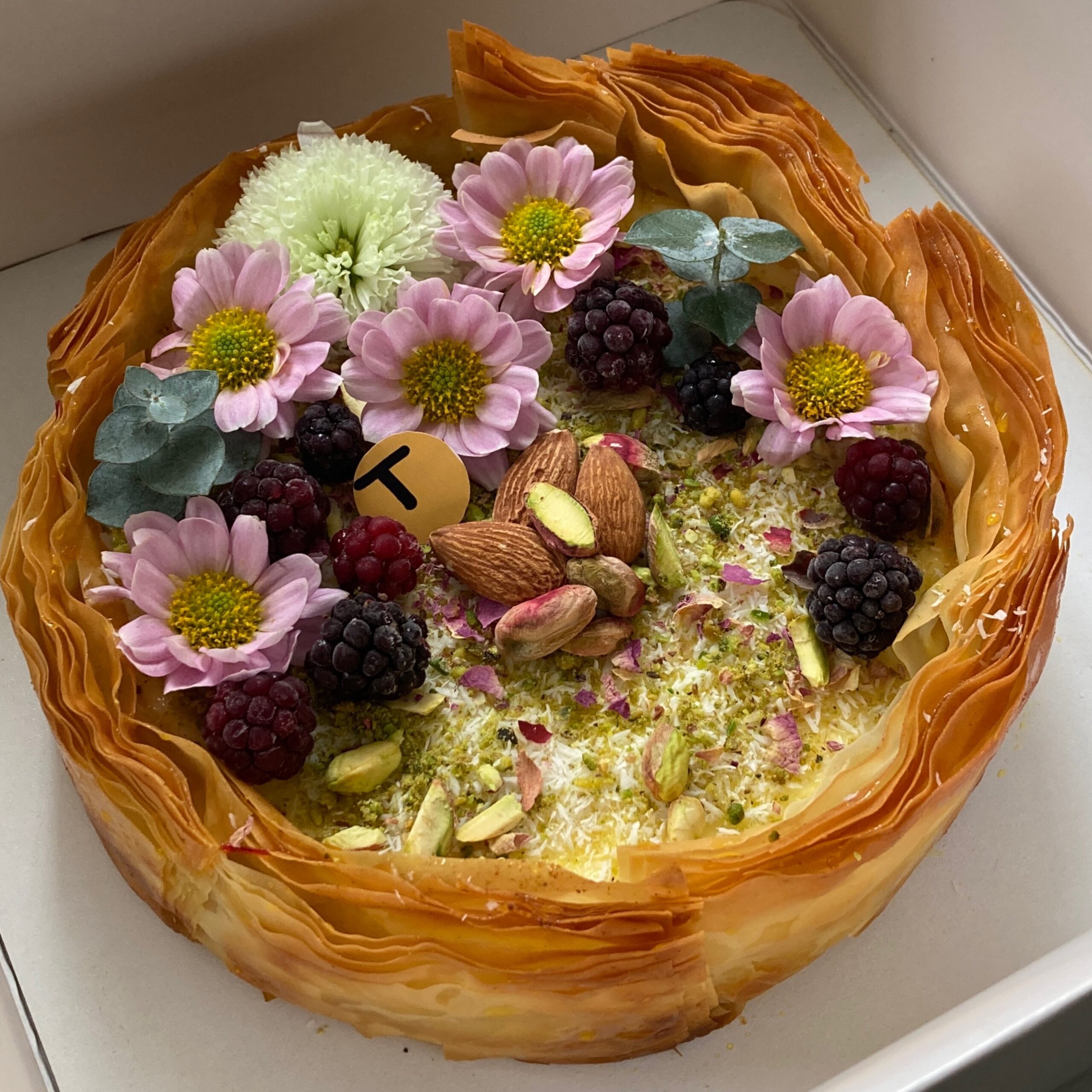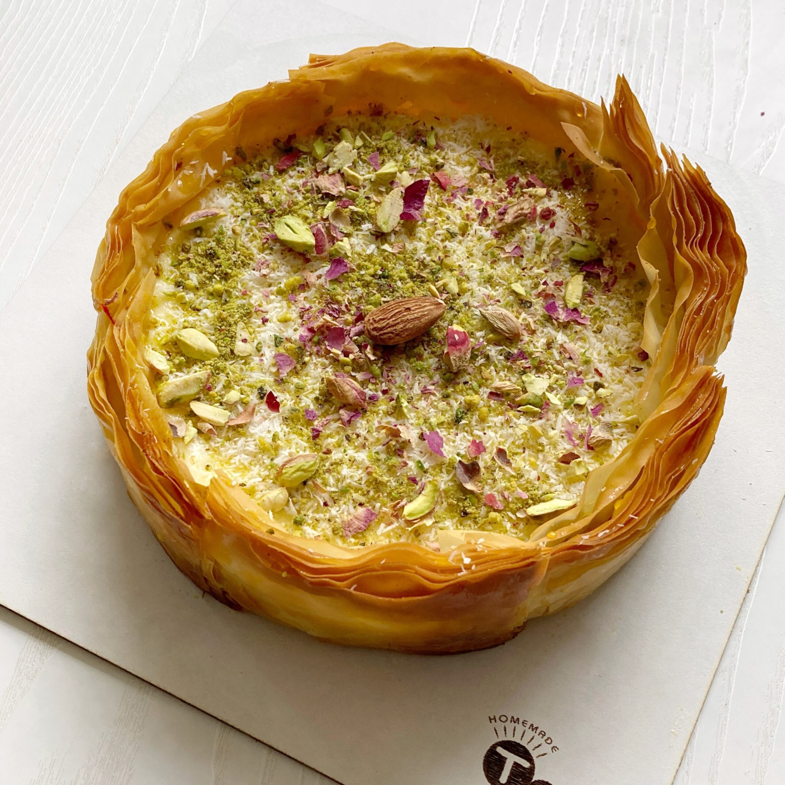 خمیر باقلوای زعفرانی آغشته به شربت باقلوا | یک لایه پودر بادام و پسته | کرم پنیری وانیلی که با انواعِ مغزیجات و پودر نارگیل دکور می شود.