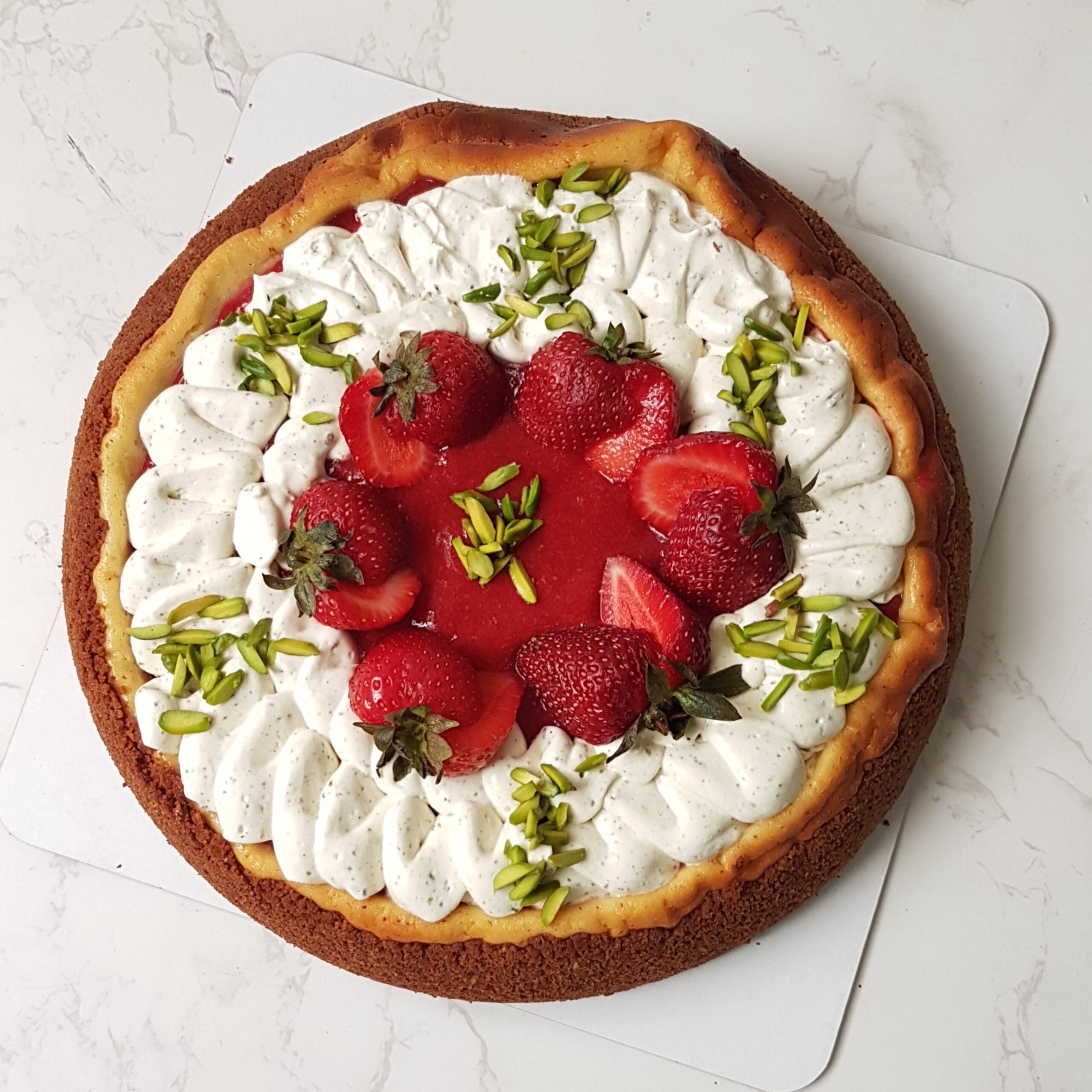 چیزکیک تنوری پسته توت فرنگی ؛از لایههای زیر تشکیل شده: