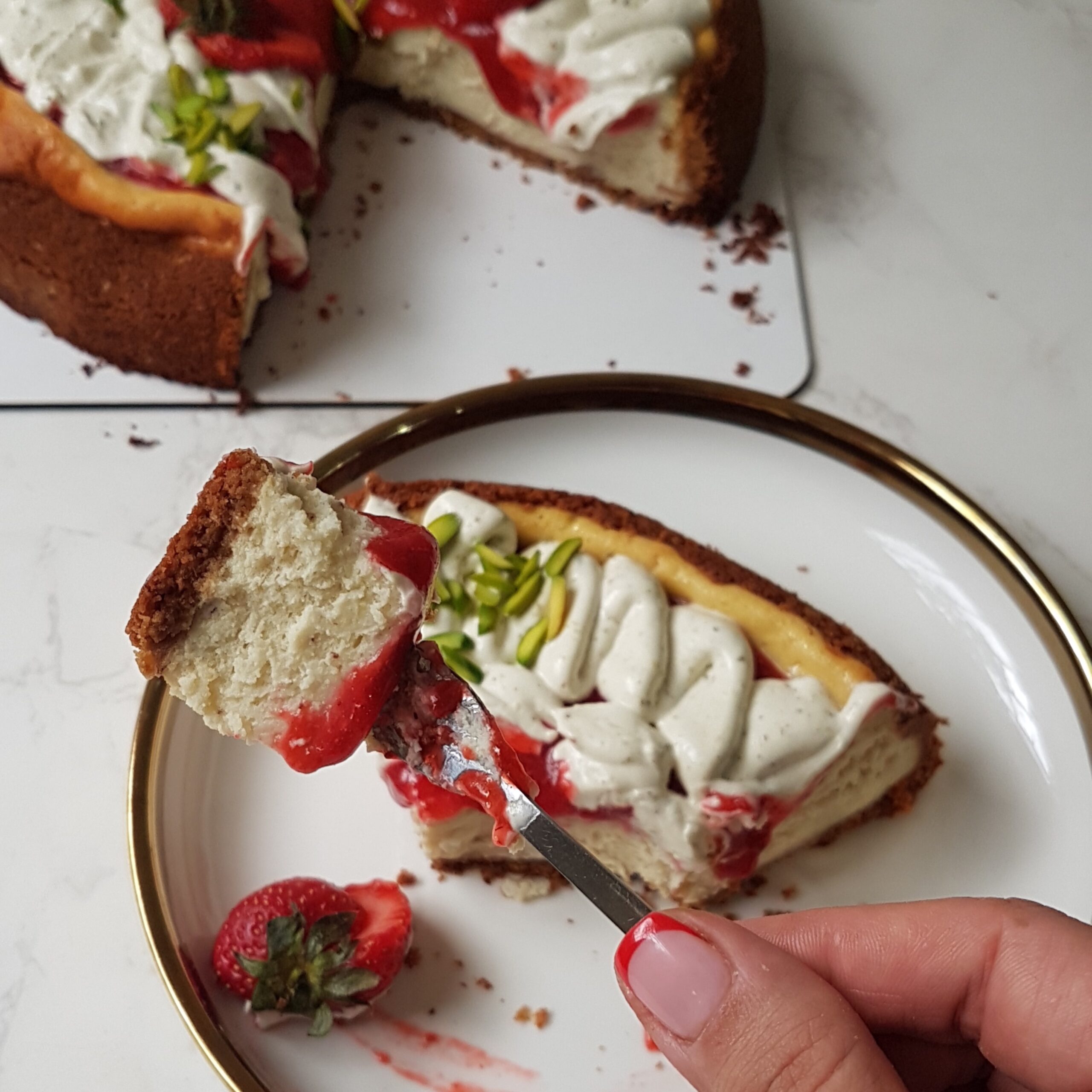 بیسکوئیت کَرهای | کرم پنیری با طعم پسته | کمپوتهی توت فرنگی | گاناش مونته پسته